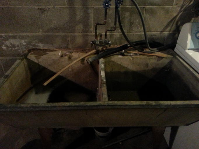 This wasn't your normal fiberglass sink. It's concrete and the left side has the old washboard in the side of the sink. I called Brian down to see if he could do something about the pipe leaking, and after some grumbles about old houses, he said the trap needed to be replaced. He started to take it off, and I headed back upstairs. A little while later, he came up and said we had to replace the whole sink because when he tried to get the trap off, the whole drain broke out of the sink.